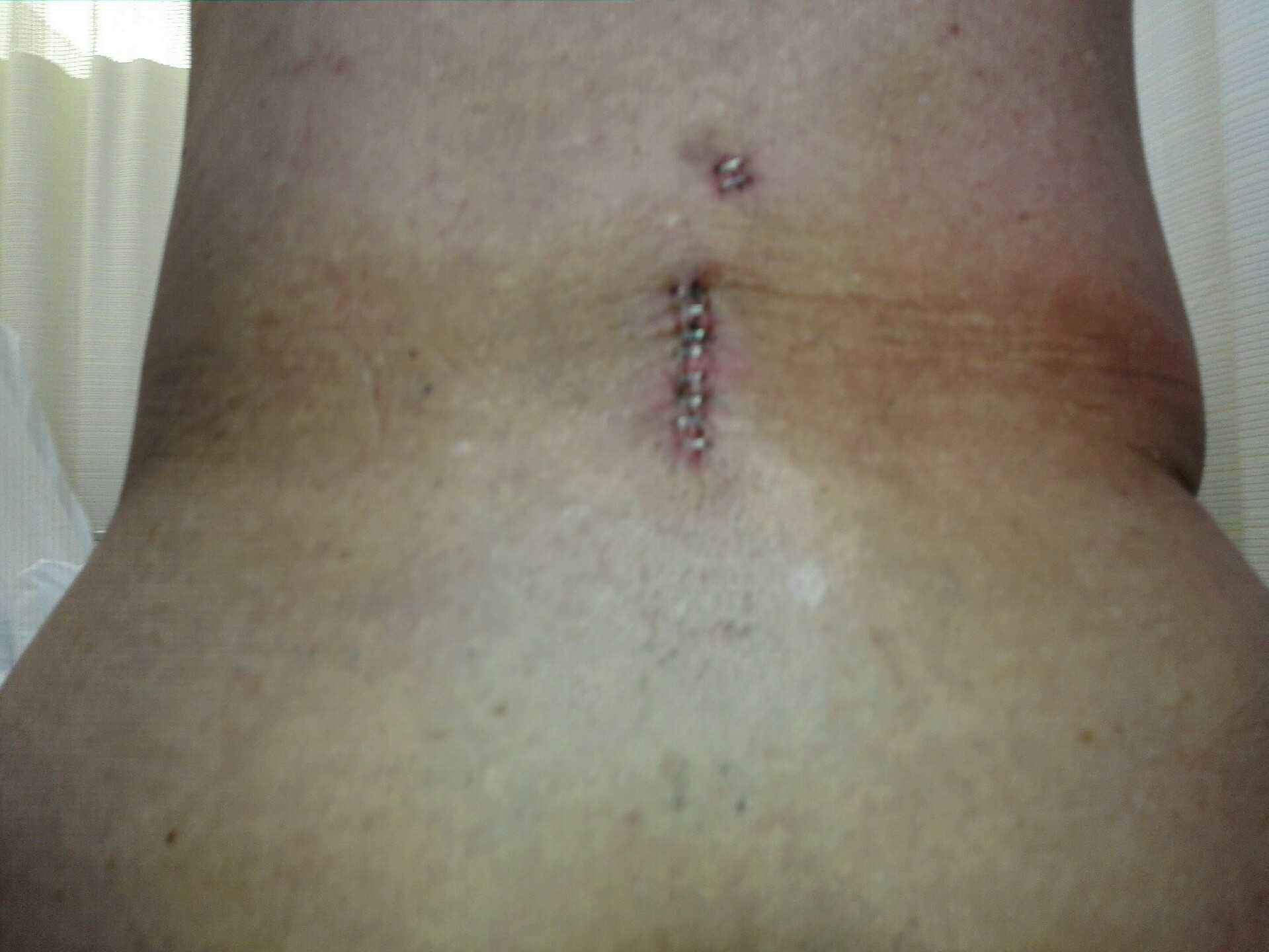 術後三日になりますが、脚の痛みの変化、改善は全くありません。 歩くと右脚が痛い。 主治医の中村先生が来ましたので、症状を説明。 色々、症状について質問はあるが、具体的に対策などの説明は無し。 とりあえず、傷口は綺麗になってきたので、ガーゼを外してくれました。 5センチ位の縦傷とその上はリンパ液を出した穴の傷です。 この穴は医療用ステープルで縫合されているので、後日、抜糸します。