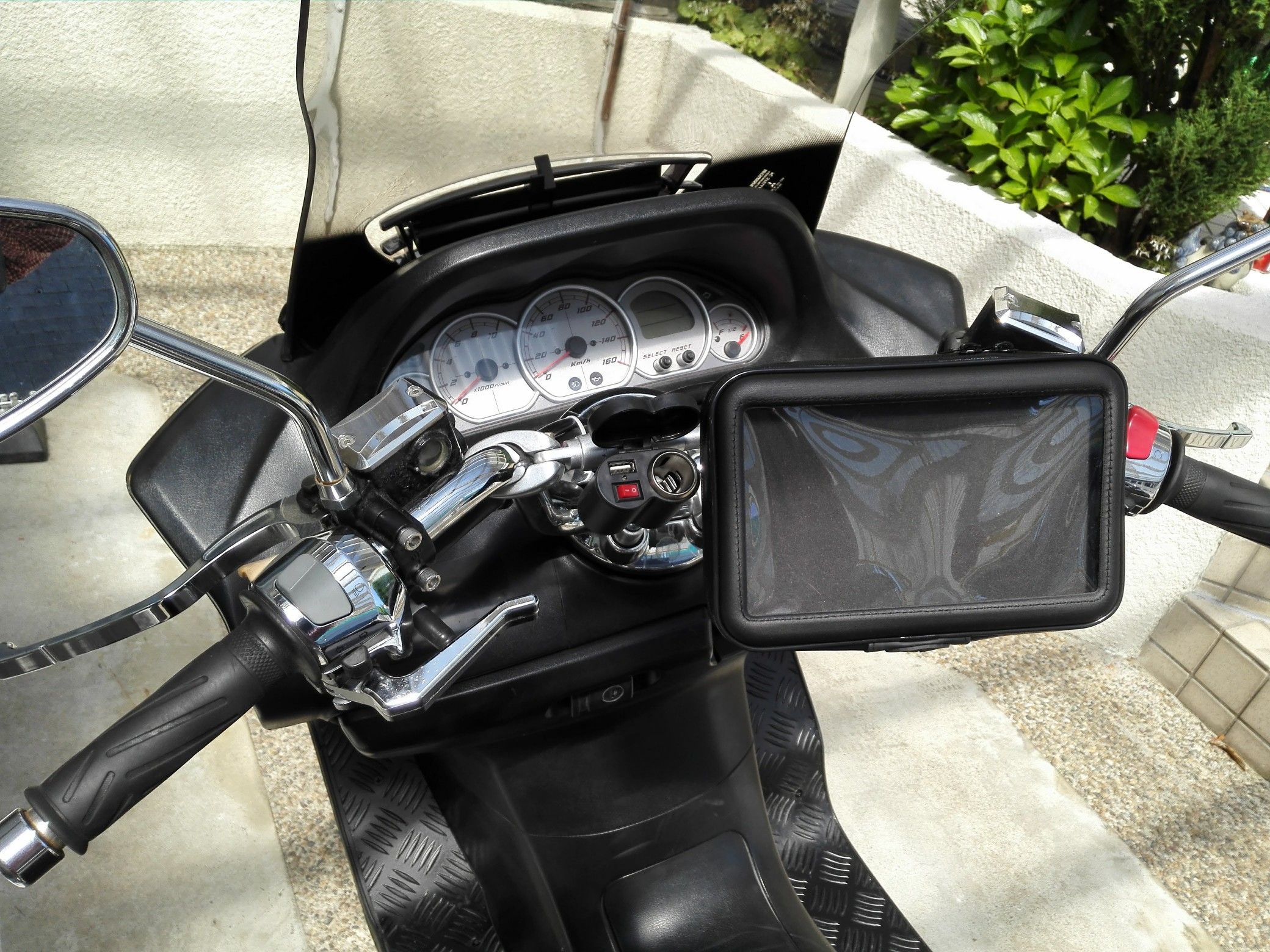 スマホのナビを付けてテスト走行しましたが、スマホがかなり高温になります。特に炎天下での走行は危険と判断してバイク用ナビを取り付けました。電源はカウリングを外して、フォーンから取りました。 テスト走行は後日。