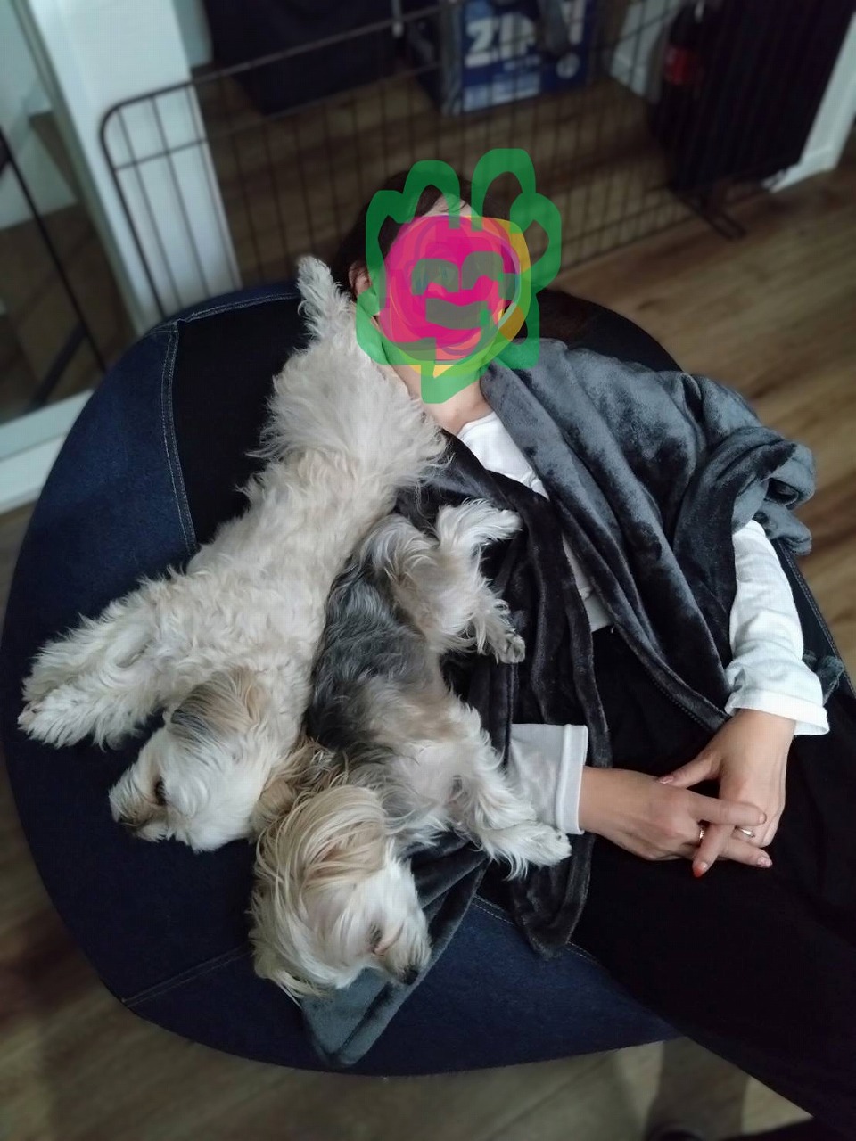 かーちゃんがビーズクッションでウトウトしていると必ずくっついてきて一緒に寝るわんずそしてジルとピノの足に思いっきり蹴られながら爆睡するお疲れのかーちゃんジル、ちょっと蹴りすぎちゃうん???首曲がってるわよ