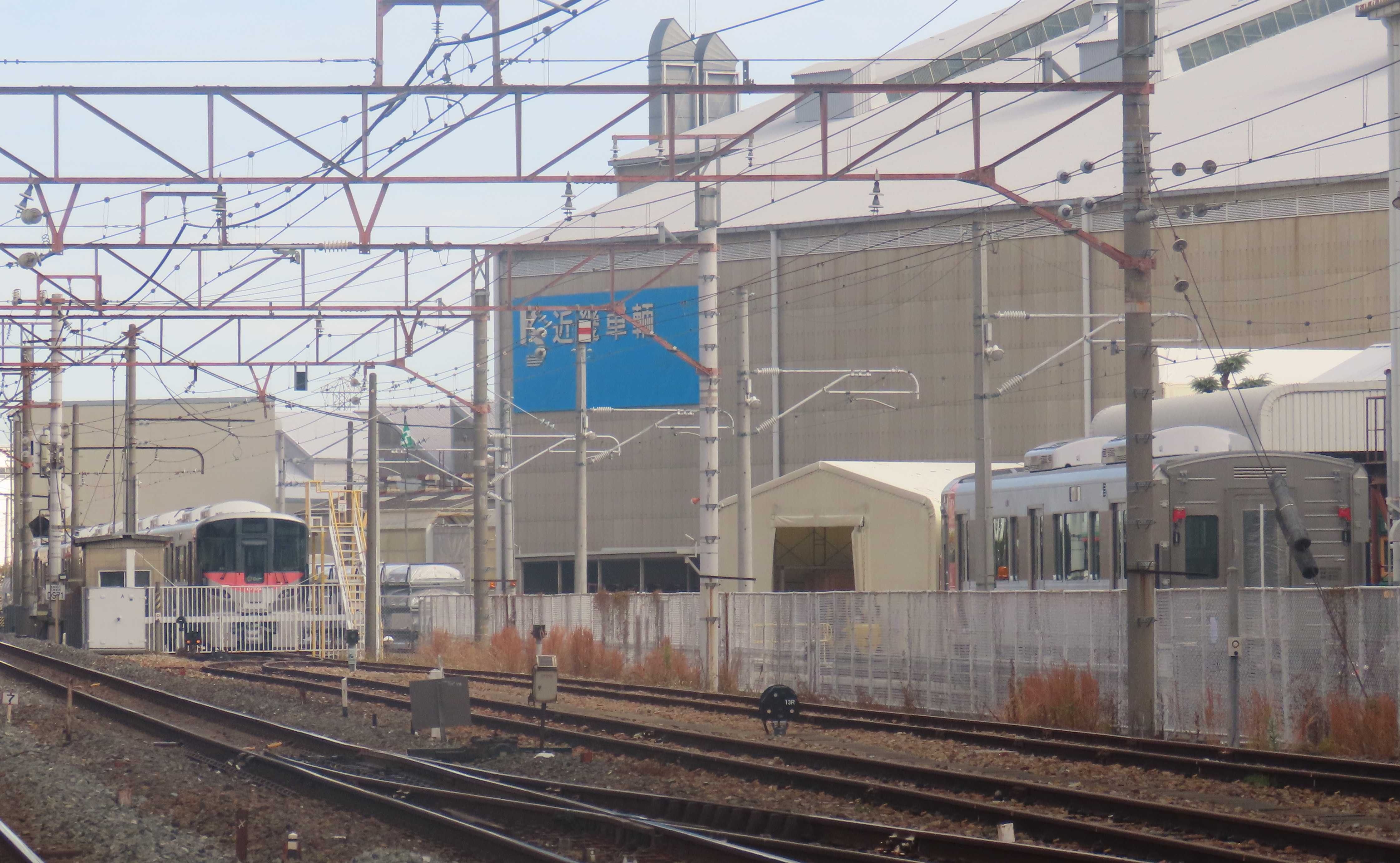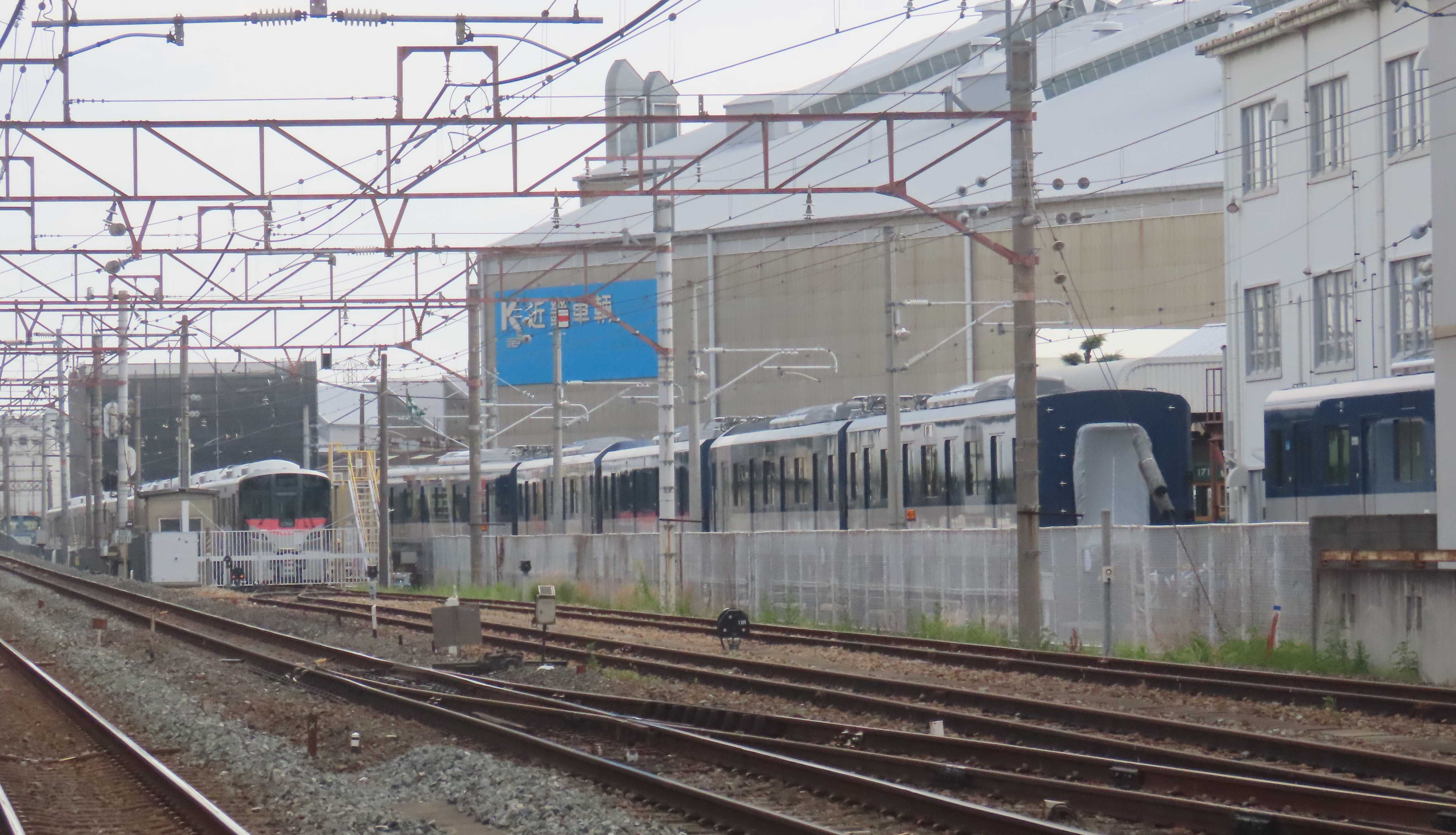 近畿車輛では今週末に出場する伊予鉄道の7000系の組成が完了しています。前回同様、3連+3連での出場となります。また、年内に出場する東武鉄道の80050型も確認出来ます。80050型は既存の60000系改造車組み込みの編成となります。近畿車輛に残る60000系は1両だけなので、出場するのは5連+4連、または4連+4連なのか楽しみです。227系500番台『Urara』はR36まで確認済。今日、試運転を繰り返していたのは2連×3本でR31+R32+R33と思われます。580番台の3連車は確認出来ていないので、12月に出場するのも2連×3本でしょうか・・・580番台の3連車が確認できると組み合わせも変わります。近鉄では1A系の第5編成、また、8A系カラーの車両も確認出来ます。1A系は2025年度に大阪線系統に4連×2本、名古屋線系統に4連×3本が導入されるので、この第5編成で出揃う事になります。8A系カラーは8A系でしょう。グランド跡の227系500番台『山口車』は残り13両となりました。『山口車』の製造も本格的に始まっている事は外観デザインも決まっているのでしょうね。目撃出来る日も近そうです・・・<1>徳庵の踏切から