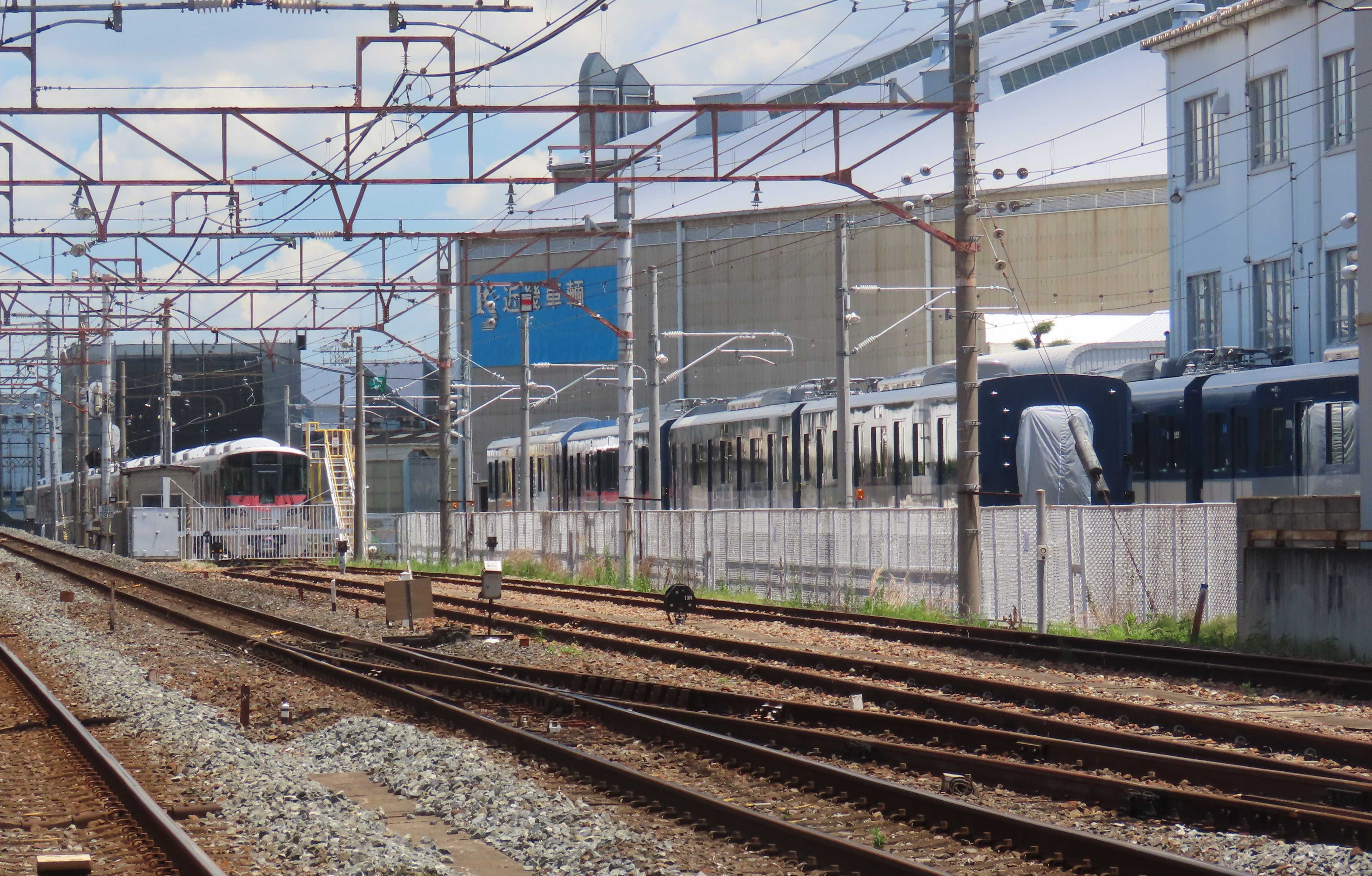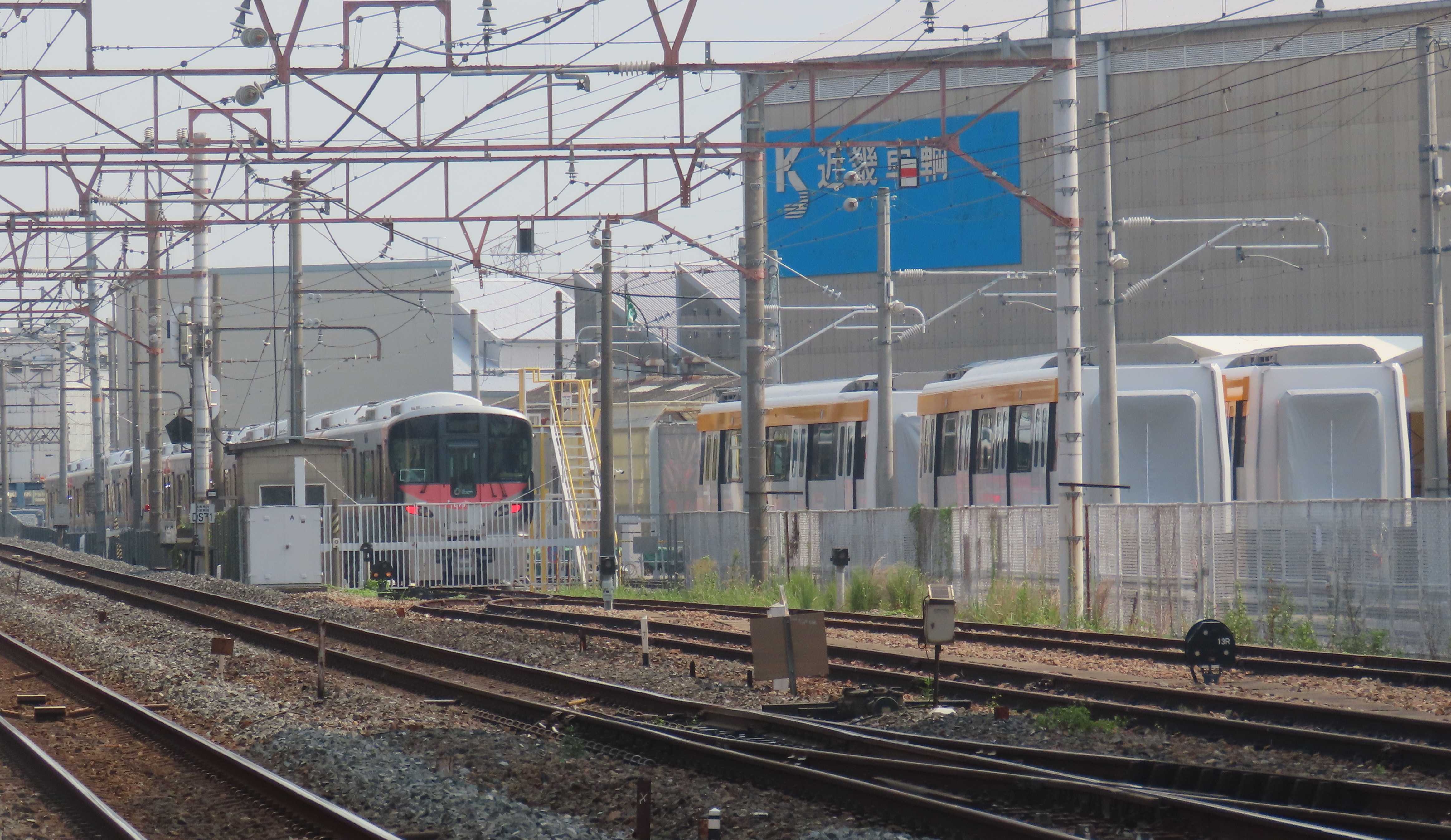 近畿車輛では次に出場する227系500番台の組成が完了しています。出場は来週と思われます。試運転付近にも別の227系500番台がいます。現在まで確認出来ているのはR25,L36までの編成。建屋内にも227系500番台が確認できます。7連、8連、7連、8連と交互に出場しているので今回は7連なので7連 R22+R23+L338連 R24+L34+L357連 R25+R26+L36の順に出場すると思われます。また、試運転付近には東武鉄道の60000系改造車もいますので、来週、227系500番台が出た後に60000系が組成されるでしょう。近鉄の新型通勤電車8Aは第19編成、第20編成の他、建屋内にも8A系がいます。南側の留置場には1A系の1A201,1A301の姿が。<1>徳庵の踏切から