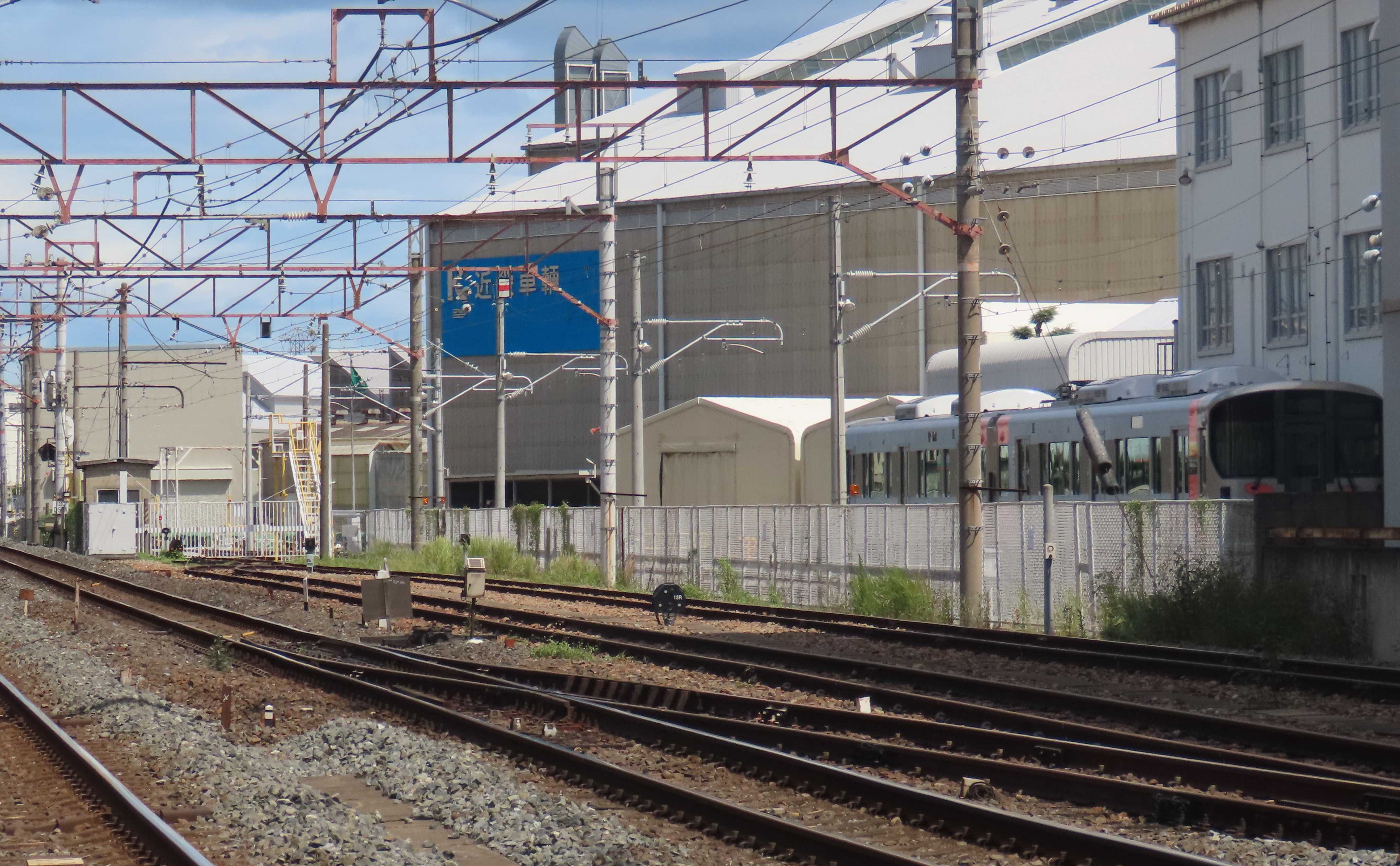 近畿車輛では次に出場する227系500番台<Urara> が出て来ています。今回出場するのは7両編成で、R28+R29+L39。まだ、各編成は連結されていませんので出場は9月18日<木>でしょう。試運転付近にも別の227系500番台が確認できます。10月出場分のR30+L40+L41と思われます。建屋内にいたオレンジ色の伊予鉄道の新型車両7000系も出てきました。近鉄の新型通勤電車1A系は間もなく陸送されると思われます。<1>徳庵の踏切から