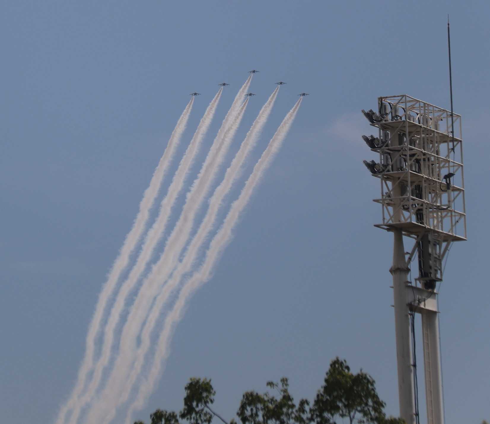 万博の開幕日は悪天候の為、展示飛行が中止になったが、開幕折り返し日の7月13日を前に、今日と明日の2日間、再び展示飛行が行われる事になりました。今日は大阪城公園内で撮影する予定で出掛けましたが、予想をはるかに超える人出だったので、読売TV前で撮影する事にしました。橋の上は身動きが出来ない程混雑していました。<1><2><3><4>復路は予想していたコースより外れました・・・往路と同じコースで大阪城に飛んできました。<5><6>