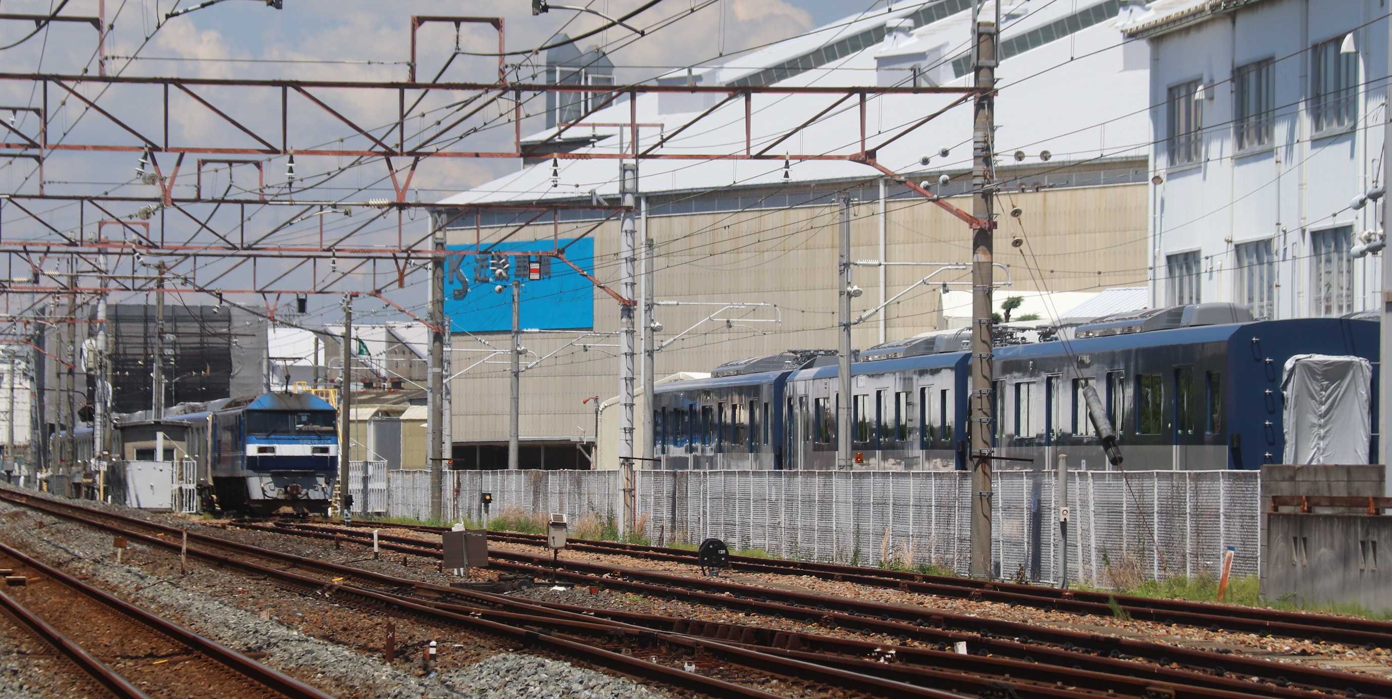 本日、近畿車輛から東武鉄道の60000系改造車が出場しました。出場したのは東武アーバンパークライン用の60000系改造車の5両編成で、東京方より65501+64501+63501+62501+61501。今回より牽引機が新鶴見のEF210に変わりました。学研都市線にも電気機関車が走る時代になりました・・・<>まずは徳庵の踏切からとうとう徳庵の奥地までEF210がやって来ました・・・<2>新鶴見のEF210-114<3>夏空の下で出発を待つ東武鉄道の60000系放出駅に移動して待つ事1時間・・・<4>やって来ました・・電気機関車<5><6>この後、近畿車輛では次に出場する227系500番台の組成が行われます・・・