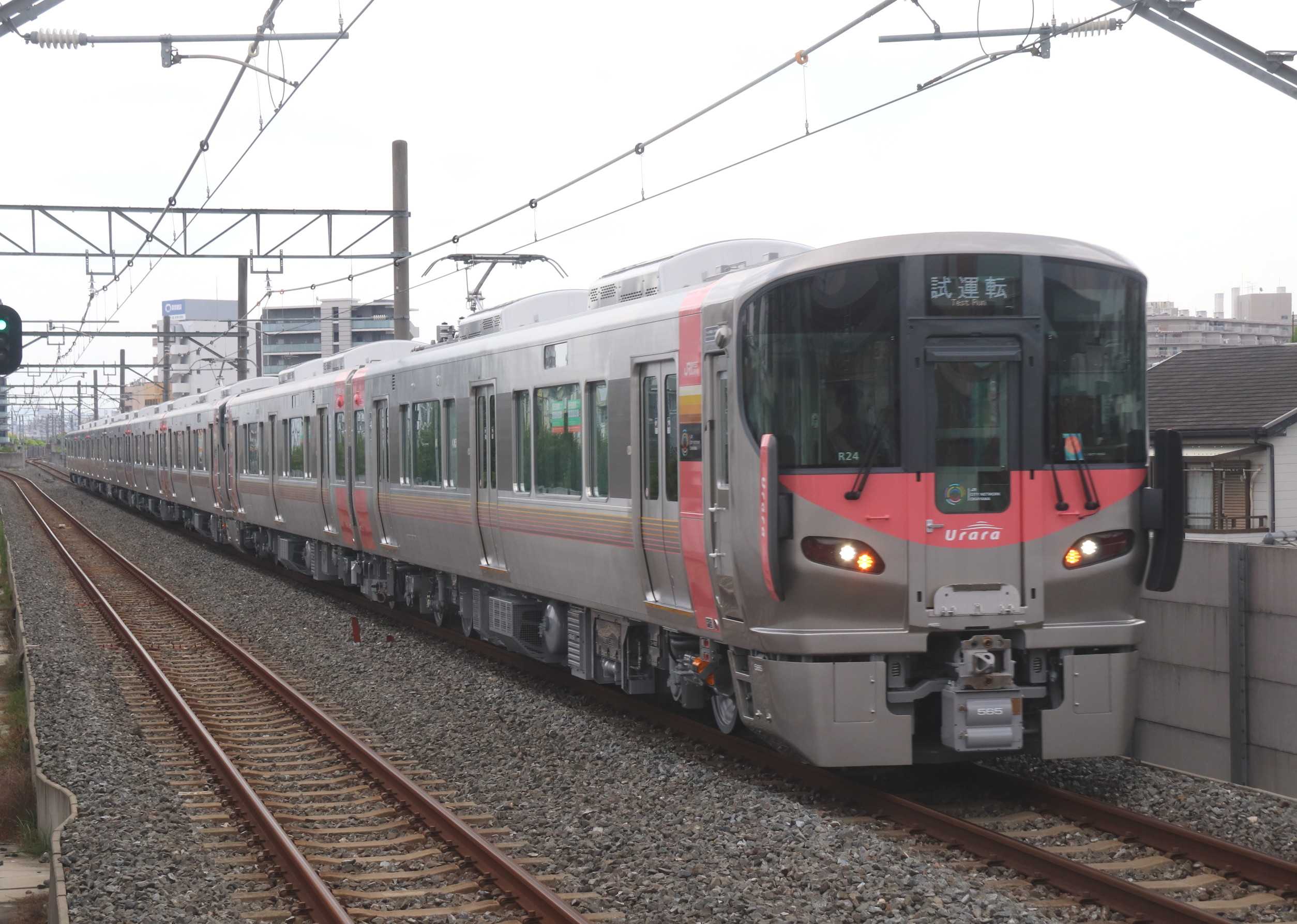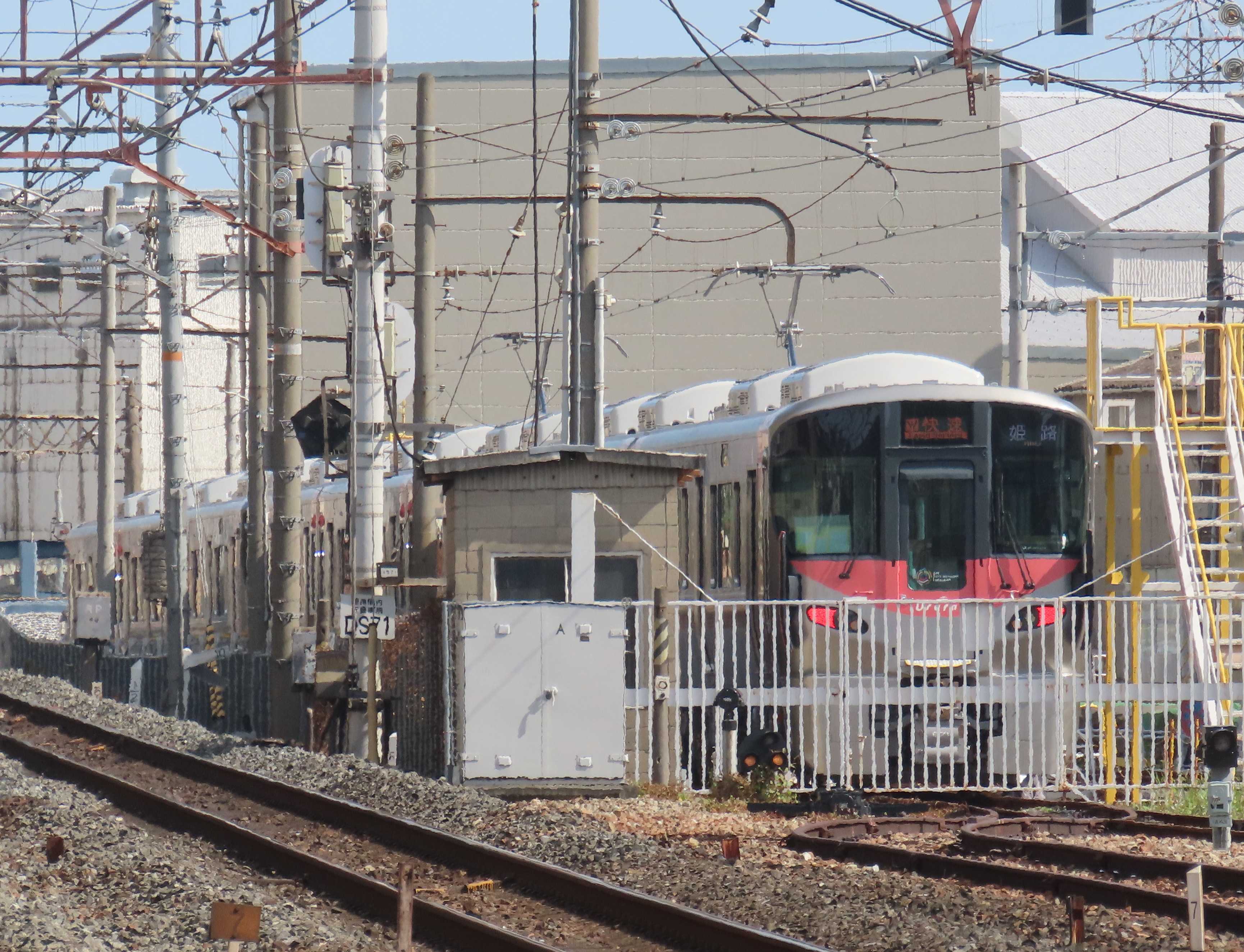 近畿車輛では9月18日に227系500番台が出場しましたが、今日現在、次の227系500番台は出て来ていません。次に出て来るのは10月出場分でR30+L40+L41の8両編成。北東側グラント跡の岡山車は残り1本で584の3両編成となりました。後の22両は585以降の山口車。227系500番台『Urara』も順調に出場していますので、2026年製も前倒しで出て来るかも知れませんね。確認出来ている車番から推測すると227系500番台岡山車『Urara』は2次車は2連車R38まで、3連車L46までになりそうです。<1>徳庵の踏切から※227系500番台は11月出場分の572の2連車