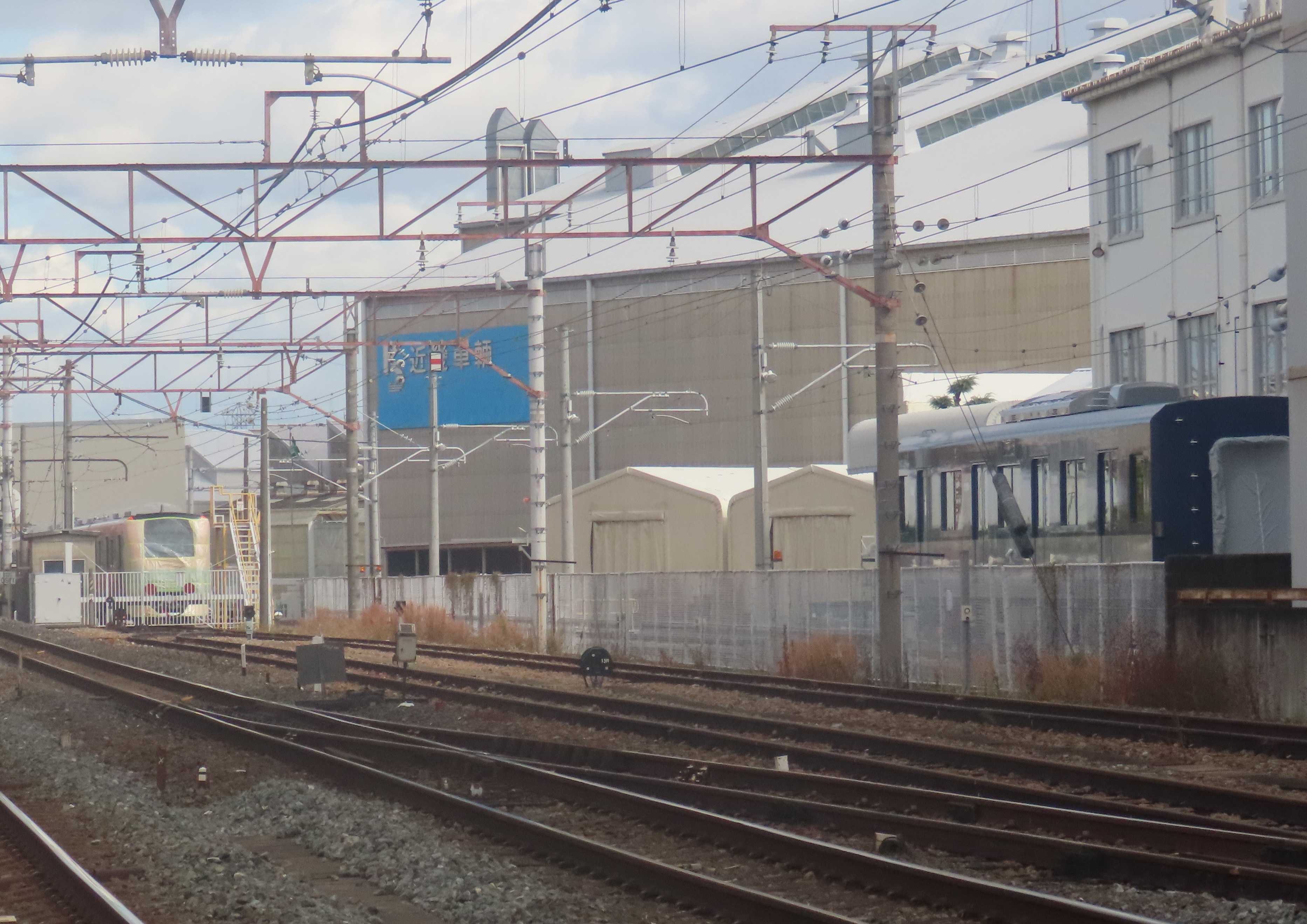 近畿車輛では次に出場する227系500番台『Urara』の組成が行われています。今回出場するのはR31+R32+R33の6両編成。車番は572+573+574。11月最終の木曜日の出場と思われます。別の編成も確認出来ていますので、その分は12月の出場と思われますが、車番は575+576+577になりそうですが、過去に確認出来ている製造銘板では2026年製となるので、前倒しの出場でしょうか・・・また、578+579+580も2連車になりますが、581~584は『Urara』の3連車と思っていましたが2連車かも知れません。227系500番台山口車『Kizashi』の本格的な製造も始まっています。グランド跡に留置されていた3連車の585、586、587が建屋内に運ばれていますので、山口車『Kizashi』は3連車から出て来るのでしょうか・・・過去の観察状況から建屋内に入ってから表に出て来るまで3か月程度かかるので、山口車『Kizashi』が出て来るのは年明け1月下旬以降と思われます。一方、東武鉄道の80050型は少なくとも3編成分確認出来ています。12月に出て来そうなのは4連+4連と思われます。<1>徳庵の踏切から右はMc226-574出場線にいるのはR31Mc227-572先頭の5両、その横には227-500のクーラーが大量に山積みされていました。