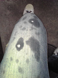 霰と雹の違いがよくわからず、広辞苑で調べてみたところ、雹は霰に含まれるようです。今日、自転車に乗っていたら(信号で停止中)、空から白いものが、地上に「べちゃっ!」と落ちて来ました。え?鳥の落とし物?!と思ったのですが、よくよくみると、そのまま白いものは地上に溶けて行きました。家からそんなに遠い場所ではなかったので、そのまま自転車を漕ぎ続けたところ、だんだん「べちゃ」から「パシン」と音が変わって行きました。そのおかげでひどく濡れることはありませんでしたが、眼鏡にコンコン当たって、壊れるのではないかとドキドキしました(^^;)家に辿り着いた時の腿です。白いのがパンツの上から、かたまった霰です。自転車に乗っている時に雨に降られることはよくありますが、霰に降られたのは人生初めてです(笑)。