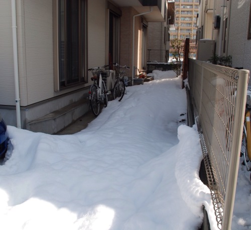 ベランダにも雪が積もり、扉の高さまで積もっているので、扉は開けられません(笑)。まだ雪は氷にはなっていなかったので、無事に玄関の扉は開けられました。