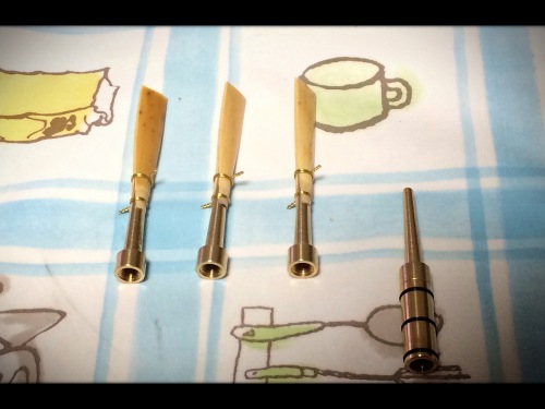 今日は友人がリード作りに我が家へ来てくれました。友人は音大時代の同じオーボエ専攻の同級生ですが、楽器を吹かない主婦になって長く、最近、楽器再開しました。リードの作り方をど忘れしました!と言うわけで、昔は同じように作っていたハズが、今日は自分が先輩(先生?)のようになったワケであります。用具はもちろん揃っていますので、友人も使い方を思い出した模様です。自分も新しいチューブとケーンで試しに作ってみました!このチューブは「chiarugi」というブランドです。なんと、下の部分が取り外し可能で、45~48にまで、上がそのままで変更可となります。ちなみに、上のケーンは「アリオード」というブランドで、サイズは「Reeds'n Stuff」の「Bourgue」です。さて、仕上がりはいかに!!一緒に友人とランチもして、最近は自作質素ご飯に憂鬱になっていたのを一気に発散しました。久しぶりにゆっくり会え、いろいろなお話が出来て良かったです。