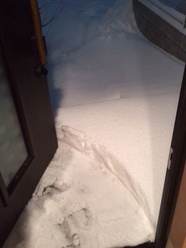 夕方になって、どんどん雪が降り積もり、気付くと、ドアの前にも雪が。。。玄関前に屋根はあります。前回や、去年の大雪の時は風がなかったため、大丈夫だったのですが、今回は風も強かったので、吹き込んで来てしまいました。ドアの前に雪が積もるなんて初体験です。実家に連絡したところ、やはり雪はこちらほどではないようです。格子のある窓にもどんどん雪がくっついていきました。さて、翌朝はどうなるのでしょうか。。。