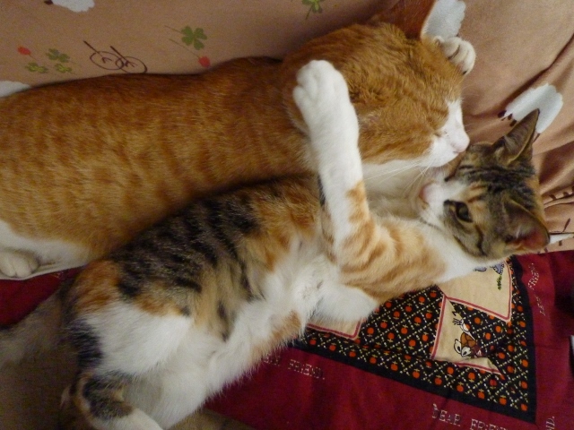 昨年の8月に保護した半蔵くん(♂ 推定1歳半)なんだけど、なかなか私達家族や他のに慣れなくて、ご飯食べる所も寝る所も別にしていたのそれが今年になってから、みんなが居る部屋に自分から入って来るようになって、ご飯も他のちゃん達と一緒に食べる様になったのよかった、よかったこのままずっと慣れなかったら「どうしよう」って心配していたんだけど、「ホッ」まだまだ、他のちゃん達に比べると警戒心が取れてないけど、時間を掛けてゆっくりとねひめとの「じゃれあい」も見られる様になりましたひめからやられてると思ったら、ちゃんと逆襲もしてた