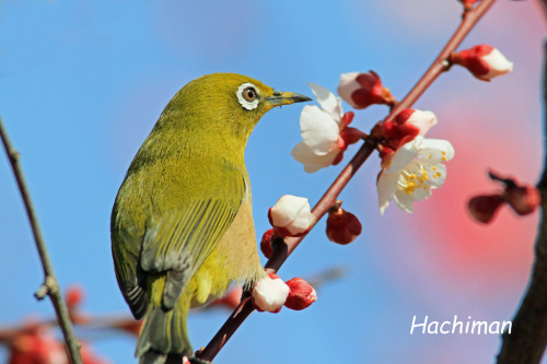 昨日午後天気も良くなりましたので T公園の梅が咲いているかなと出かけて来ました。豊後梅はまだ満開まではもう少しですがしだれ梅はほぼ満開になっていました、梅に来るメジロと暫らく遊んで貰いました 豊後梅に来て蜜を探しているメジロ この子はそりかえって蜜を探しています 此方は蜜を吸うのに集中しているメジロ この時期は豊後梅が好きなのかな?背中にかんざし やっと紅梅に来てくれました そしてしだれ梅にも来て蜜を吸っていますしだれウメジロ posted by (C)Hachiman