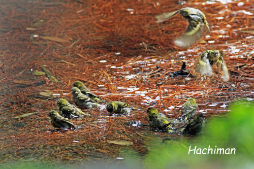 今・別府は温泉祭りで賑わっていますが、野鳥たちも気持ち良く水浴びをしている所が有ります。 最初はマヒワの群れが一斉に水浴びを始めました 次はマヒワとカワラヒワとシメの混浴風景です 今度はカワラヒワとスズメなどの混浴の様子 ビンズイもやって来ます マヒワの間でビンズイ君飛沫を上げて水浴びビンズイ posted by (C)Hachiman