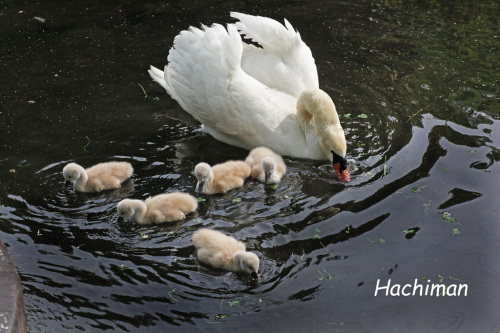 志高の コブハクチョウの雛が孵化して4日目に覗いて見ました私の帰った午後3時過ぎにもう1羽孵化して全部で5羽になっています 孵化した横の小さな池で親子で仲良く泳いでいました もう雛は係員に貰った草を食べています 親子は何時もぴったりと寄り添っています