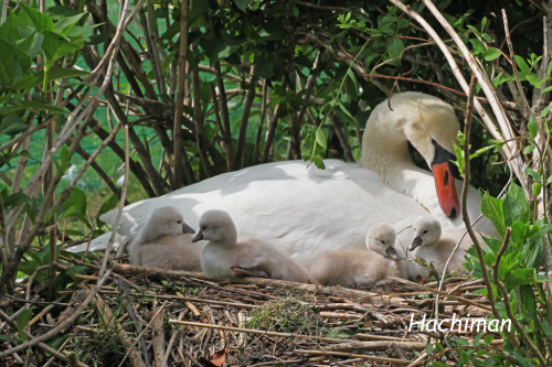 志高湖のコブハクチョウは今年も抱卵中でしたが16日の朝から雛が出始めて午後2時には4羽の雛を確認し、まだ卵が3個ありましたが無事に全部孵化するといいですね。 親に見まもまれふわふわの羽毛に覆われています 孵化してそんなに時間がたっていないのにもう草を咥えています