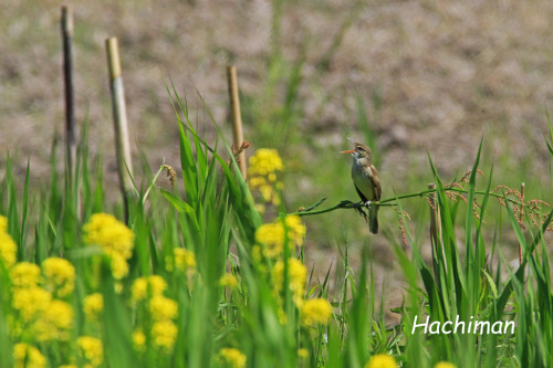何時もの鳥友から菜の花に留まる オオヨシキリは要りませんかと連絡が入りましたので教えて貰ったポイントへ着くとすでに田圃の中で撮っていましたので横にお邪魔させて貰いました。 最初は菜の花ではなく何か草の茎に留まっていました 暫らくして菜の花に留まってさかんに囀っています 少し違う角度に移動してバックにレンゲを入れて見ました 此方は少し遠かったけど杭に留まって囀っていますオオヨシキリ1 posted by (C)Hachiman