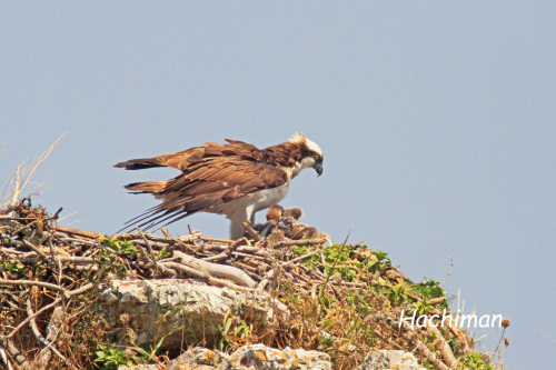 先日鳥友のYさんからの情報で県南の岩場でミサゴが子育てをしているとの事でお邪魔して来ましたが、天気が良すぎて岩場が焼けて陽炎がたちピントを合わせるのが大変でした、何とかマニアルで合わせて撮りました今回は 雄が獲って来た餌を自分で食べ 雛に持って来ませんでしたので食事の様子は撮れませんでした、また次回に期待します ミサゴの親子、雛は2羽確認出来ましたまだ孵化して4~5日かな? 雛はかなり暑そうです、大丈夫かな~ そのうちお母さんは水に飛び込んでお腹を冷やし帰って来ました そして雛の上に覆いかぶさって影を作り冷やしていました 上空を飛ぶトビやミサゴに向かってお母さんは雛を隠し威嚇していますミサゴ威嚇 posted by (C)Hachiman