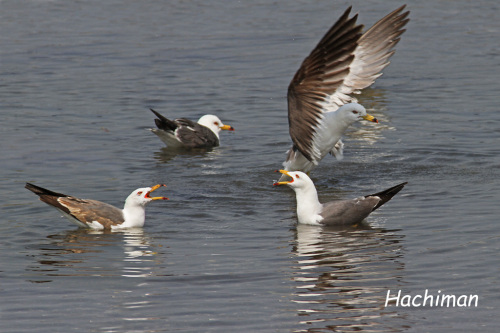 先日 日出の港の傍で何時も群れている ウミネコの様子を撮って来ましたので紹介します。 河口で水浴びをしている時に何かもめているウミネコ 水の中から何かマキガイみたいのを持ってきたウミネコ 此方も何かもめている様です、睨みあっています 此方のウミネコの若も何か貝を持って来ました そしてすぐ横の堤防の上に来たハシブトガラス 近くで見ると羽はきれいですし顔は迫力が有りますハシブトガラス posted by (C)Hachiman