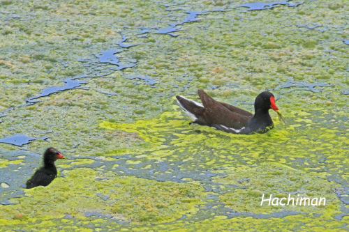 先日大分の調整池を通りかかった時何か黒い鳥がいる様なので確認して見るとバンの親子が泳いでいましたので撮って見ました。 青い藻がいっぱいの中を親子で泳いでいます 親は雛に何か藻の様なものを与えています 暫らくして水草の中にみんな集まっています、雛は6羽いました その後親は水浴びして羽を バサバサバン親子2 posted by (C)Hachiman