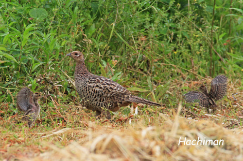 先日いつもの鳥友からキジの親子がお散歩しているとの情報が入りましたので翌日ポイントで待ち合わせ 暫らく探していると昨日の雌がいるよとの事で行って見ると半分草刈りをした休耕田で餌を啄んでいました。 親に餌をねだっている可愛いキジの雛達全部で5羽いました 雛を羽の下に入れていましたが親が餌を食べに動くとまる見えですよ 今度は親が2m程の上の段に行くとこの小さな雛達が飛び上がりました 上の段に来た雛たちも動きが早い3羽は藪の中に 近くで見ると体は小さいけど足はさすがに丈夫そうです