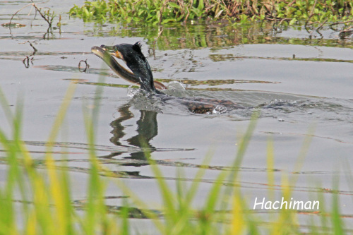 先日のシマアジの撮影中カワウが見事なうなぎを捕まえて浮いて来ました 大きな長いものを咥えて来ましたがうなぎの大物です 嘴に巻き付こうといていますが大丈夫かな、この後川の中ほどに 持って行きましたがあの長いうなぎを鵜呑みに出来たのでしょうか その後 タシギが2羽餌を探しにやって来ました 川沿いでバックが良くありませんがタシギの飛び出しをタシギ飛翔 posted by (C)Hachiman