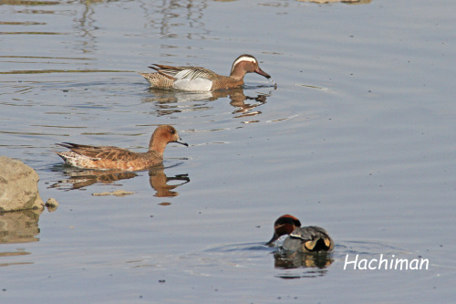 先日鳥友からの情報で シマアジがいるけど撮りに来ますかとの事でなんで魚を撮りに行くのかとよく聞くと野鳥のシマアジとの事紛らわしい名前ですね、私は初撮りでしたので本当に何時も有難う御座います。 ポイントに着くとさっきまでいたのにと言われがっくり していると暫らくして他のカモと一緒にやって来ました じっと待っていると此方へ向かってやって来ます 首の周りの色と背中の飾り羽がほかの鴨とは違いますね そして綺麗なコガもの雄とシマアジの2ショット 渡りの途中なのかさかんに餌を採っています 今度は岸辺をかなり近づいて来ました 今まで見た事のないカモです 草のない所に出るとまた雰囲気が違いますシマアジ posted by (C)Hachiman
