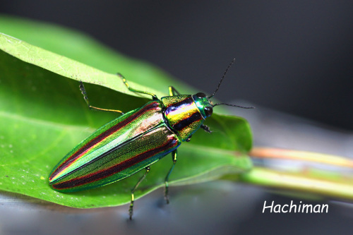 今日は家の近くで珍しく タマムシがいろんなポーズを取ってくれて暫らく遊んでくれました。 背中から見ると綺麗なメタリックな感じがきれい 小さな朽木に留まった横顔はどうでしょう 斜め後ろ横からの翅を広げた所 今度は斜め正面からの翅を広げた様子 正面からの顔のアップ 横からはこんな感じグリーンに赤い線がきれいタマムシ4 posted by (C)Hachiman