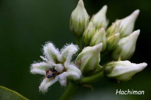 今年もガガイモとクズの白花が咲き始めたとの情報が Iさんより入りましたので早速何時ものポイントへ出かけて来ました 朝ポイントへ行って見るとまだ一輪だけ咲いて中にカメムシが 近くを散策した後の昼ごろもう一度覗くと3輪になって 一般に見れるガガイモは薄いピンク色をしてます もう一ヶ所のクズの白花は今年は高い所に咲いていて 撮るのが大変で今回は脚立を利用して撮影しました 少し寄って花だけを撮って見ました 何処にでもあるクズの花はこんな赤紫色ですクズ・赤花 posted by (C)Hachiman