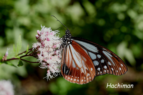 今日は、藤袴にやって来る 浅葱斑に会いに行って来ました 渡りの途中に藤袴の蜜を一生懸命吸っている浅葱斑 此方は翅を広げているアサギマダラを背中から イシガケチョウも仲間に入って来ましたが翅はかなり傷んでいます 下から青空をバックに 少し近づいてアップで撮って見ました 翅を広げた所を青空をバックにアサギマダラ4 posted by (C)Hachiman