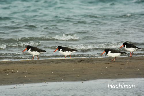 鳥友のブログを見て 守江湾にミヤコドリが越冬しているという情報でしたので行ってきましたが、見つからず、TELでポイントを教えてもらい合う事が出来ましたSさん有難う御座いました、潮が満ちていましたが何とか撮れました。 4羽が並んで、大分近づいてくれました そのうちの一羽が何か咥えましたが何でしょう 先頭の一羽が突然羽を広げたり 今度は最後尾の一羽が大きく口を広げて 此方の2羽は水浴びを始めました そして一斉に飛び立ちます はるか沖合の中州の方へ飛んで行きます