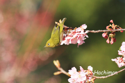 公園の早咲きの、河津桜に来るメジロと少しの時間遊んできました 枝先に留まって、反り返って何をしているのか 少し羽を広げて 逆さまにぶら下がって こんな体制で蜜を吸う 枝先からの飛び出しは羽をたたんだまま 紅梅をバックに 開き始めた寒緋桜にも、やって来ます