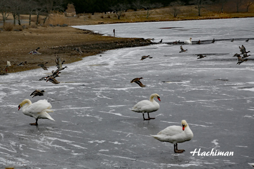 今朝も起きてみるとかなりの冷え込みでしたので志高湖まで行って見ました 着いて見ると湖の6~7割が凍っています白鳥や鴨も寒そうです 石の周りにしぶきが付いて凍って、面白い形に 氷の上に降った雪が風で色んな模様になって 入口の水飲み場の周りにもツララが