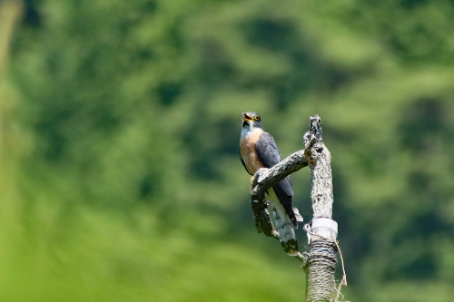 鳥友の名人が、ジュウイチの止まり木を付けてくれているとの事ですので、出かけてきました。 ちょっとすましたような顔をして 顎が外れるくらい大きな口を開けて縄張りをアピールしているのかな もう1枚 此方も大きな口を開けて目をつぶって叫んでいます 少し周りを見回して