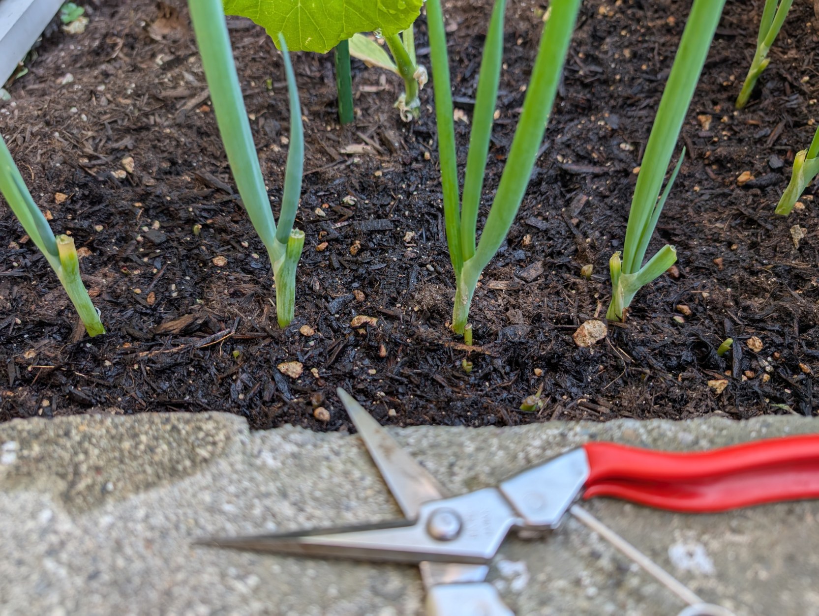ネギは新しいのが出てきたらチョッキンします。一度に取れる量は少ないですが、ちゃちゃっと洗って味噌もつけずバリバリ食べます。口の中がスースーして気持ち良いですよ。このハサミでドクダミをちょん切っていますよ。葉物の中心が巻いてきました。鉢が小さいので間もなく1個収穫します。おかずにちょいと添える程度だけど、いい感じです。今日はもっと大きくなっているはず去年、鉢植えしたミョウガは3個ほど頭を出しています。春先にストーブの暖かさであれよあれよと伸びてしまい、あね様の畑のミョウガの2倍以上の背丈になってしまい・・・折れないように添え木支柱を立てました。ゴミ出しの日はご近所さんと畑談義。小さい畑ながらも各家庭で野菜を作ってるんです。さて、6月だっていうのに今日も30度超えだって涼しい北向きの事務所に居たいけど、雑用を片づけなくちゃね。