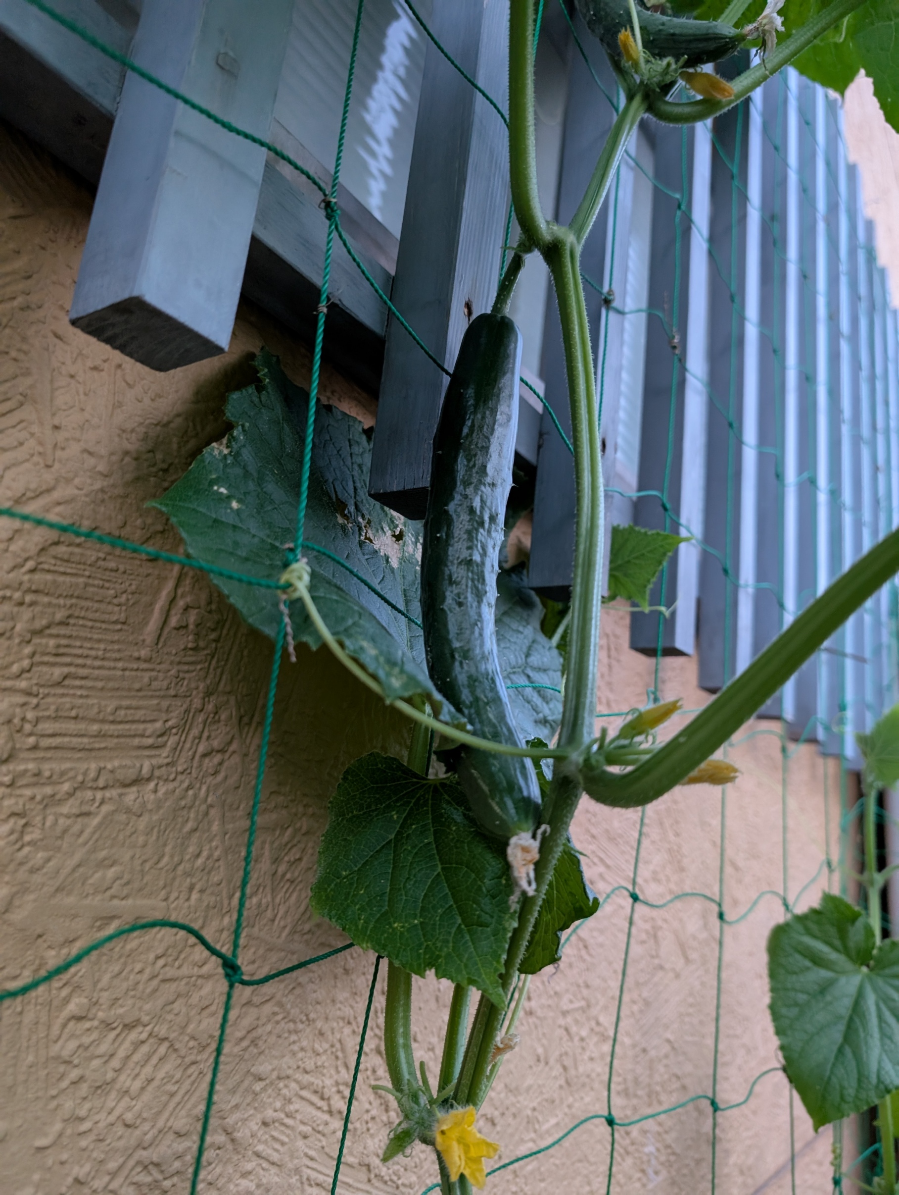 さっき、主人がトイレに入ったら目の前の窓ガラスをノックする人が居たそうな。窓を開けてみたらキュウリが2本。トイレの外に花壇のようなスペースがあって、毎年花を咲かせていたバラが枯れた後に植えたキュウリ。そいつでした今日は少し風があるので、ノックしていたのです。今朝、2本収穫してさ、その時に見つけていた私は主人に伝えておいたのですが・・・忘れていたらしくビックリしたようです。もうじき食べごろですよとノックして知らせてくれたようです。今日も36℃に近づいています。