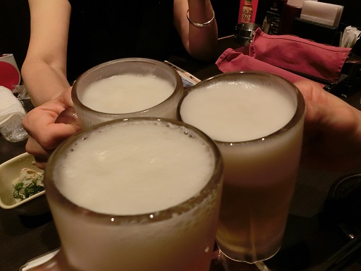 ヨーロッパ旅行中にビアガーデンに行ったハワイアンの仲間。私の無事帰国をダシにした飲み会を開催まぁ~~有難いことです^^;入店は17時半!ビール半額サービスが18時!これは一気に3杯飲むしかないでしょう~~~(爆)まずは乾杯!カクテル派のYちゃんも、まずはビールでした。お通しはアッサリ系サラダ、串盛り合わせ、枝豆、あんかけ焼きそばなどをオーダー。約3時間しゃべりっぱなし喉が枯れましたが、楽しい気の合う仲間ができたことに感謝です♪