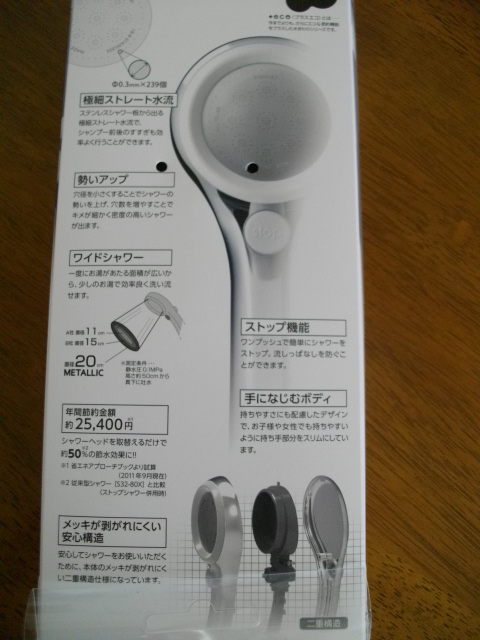 本日 節水シャワーヘッドが 届きました。商品はこんな感じのものです。50% 節水 年間25000円 節約もし本当だったらいいですよね。今回購入のシャワーです。今まで使っていた リクシルの(INAX)のシャワーヘッドです。で! このバケツに 水が 溢れるまでの時間を計り 両方のシャワーで計り単純に節水%を 出します。たぶん 18Lのバケツです。まずは リクシル バケツいっぱいになるのに 72秒でした。 次に購入のシャワーヘッドバケツいっぱいになるのに 98秒でした。水量だけだと 単純に 時間比率で 約 26% 節水になります。このリクシルのシャワーヘッドも 節水タイプなので それを 考えると すごいですね。また 購入のシャワーヘッドには ストップボタン機能付きなので使用すると とても便利です。水を止めるに いちいち しゃがんでいたのですが 立ったままシャワーの 止水ボタンを押すだけで いいので とても便利です。節水できても 使い勝手が悪いと困りますよね。バケツの水の 跳ね返りを見ていただければわかると思いますが真ん中と 円を描くように広範囲に 水が出ています。なので、全体を洗い流す時なのは 広範囲に 水が出てくるので流す時間が 格段と短くなります。実験しながら シャワーを 浴びてみましたが確かに 頭のシャンプーを洗い 流すのも今までのシャワーヘッドより 早いと思います。買って はずれだなぁ~ と 思うこともありますがこのシャワーヘッドは いいと思いますよ。(かなり気に入ってます)サンエイ 節水シャワーヘッド レイニーメタリック PS303-81XA-C ホワイトリング/RAINY(レイニー...にほんブログ村