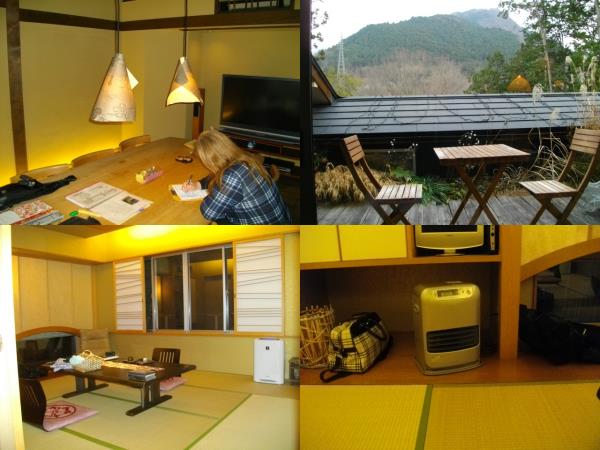 年末年始 休みなく 頑張った反動でさっそくの 逃避活動開始近場の秩父の宿竹取物語に逃避~ 久々の竹取物語で、あらためていい宿だなぁ~ とおもいつつ 実は 家で はかどらない仕事をを片づけるために かばんに PC 書類を詰め込みやってきました。(笑)遊ぶに来たのでは、ないですよ。 トホホ入ってすぐの 板張りのリビング10畳ぐらいの前にあるテラスです。前の山が 雄大でとてもいい景色です。階段降りた和室ですまわりの窓からは 竹がみえて 一枚の絵画を見てる感じです。階段は意外と広く? 部屋が離れになっていて 2階建てなんです。部屋の中に 階段があるですよ。お風呂は ジャグジーで 半露天風呂になります。正面に見えるガラス窓が全部開くようになっています。今の時期は寒いので 閉めたまま 入りますけど・・・洗面所にも エアコンが一台付いていて ホント快適な 部屋です。ついたばかりで 合間に写真を撮ってUPしました。詳しくは楽天トラベルで!!御宿 竹取物語にほんブログ村