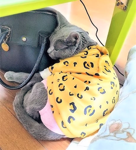 私のバッグに抱き着いて、テーブルの下で寝ている。