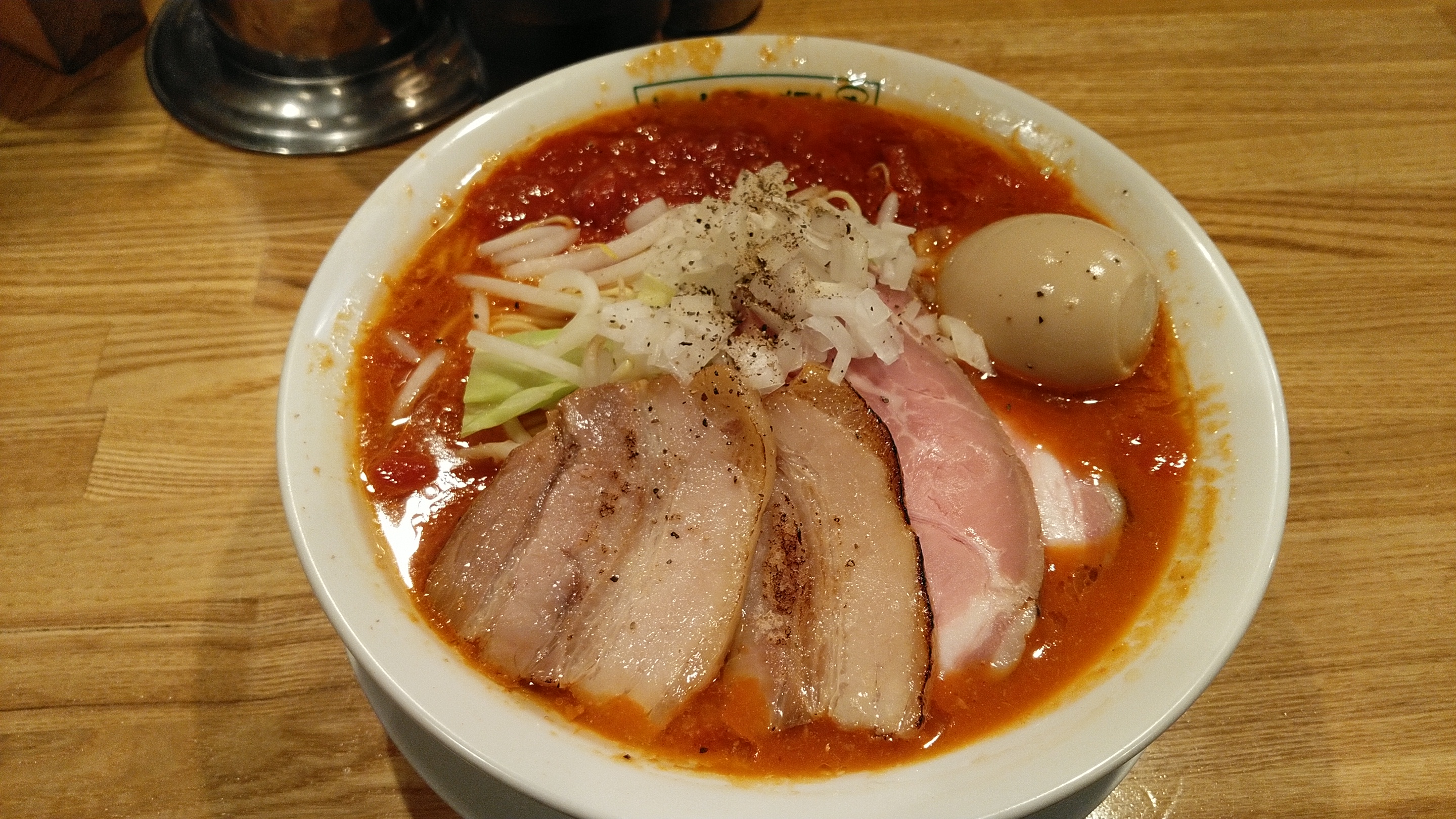 らーめんの基幹となるスープはとんこつ・魚介・トマトのトリプルスープ。これに組合わさる麺は自社製中細麺国産全粒粉。その他に味玉、玉葱のみじん切りに、厚切りバラチャーシュー2枚、厚切りバラレアチャーシュー2枚、キャベツともやし少々となっている。