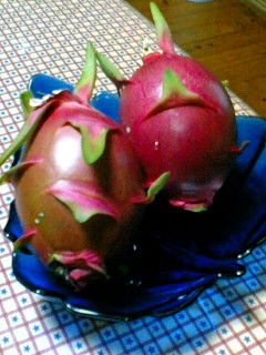 数年前からあちらこちらでお目にかかるようになった「ドラゴンフルーツ」サボテン科に属し多肉植物原産は南メキシコ、中央アメリカ諸国で熱帯に分布毎年7月から11月まで数回の収穫出来るビタミン、繊維、ブドウ糖など体に必要なミネラルを多く含んでいるらしいまた果実の中にあるゴマ状の種子は腸を刺激して便秘を改善ってことは女性にピッタリ?それでも数年前に一度食べたっきりで口にする機会もなかったそのうち気が付いたら夫の実家の庭でドラゴンフルーツを数本植えていたのです結構台風にも強いし、手間もほとんど掛からないとか・・・・今年も実をつけていたのでちょっと早いけど2個ほど貰ってきたまだ食べるには早いらしいので後数日ジッとガマンの子でいよう