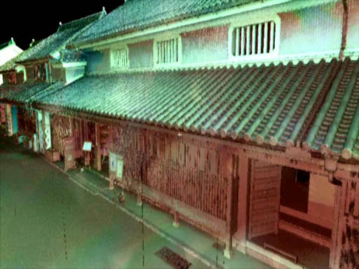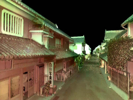 うだつのレーザースキャナーデータのスクリーンショットが何枚かできましたのでご紹介します。 前にもご紹介しましたが、三次元レーザースキャナーでとったデータは全て点データです。上の写真は点データが目立っているので少しざらついた感じがしています。 上のSSの左側はきれいですが右側は点が目立っています。スキャナーの近くはきれいに,離れるとデータが荒くなります。今回のようなデモではなく、本当の計測の場合はこのようなデータとならないように機械の設置間隔等を検討してスキャニングします。