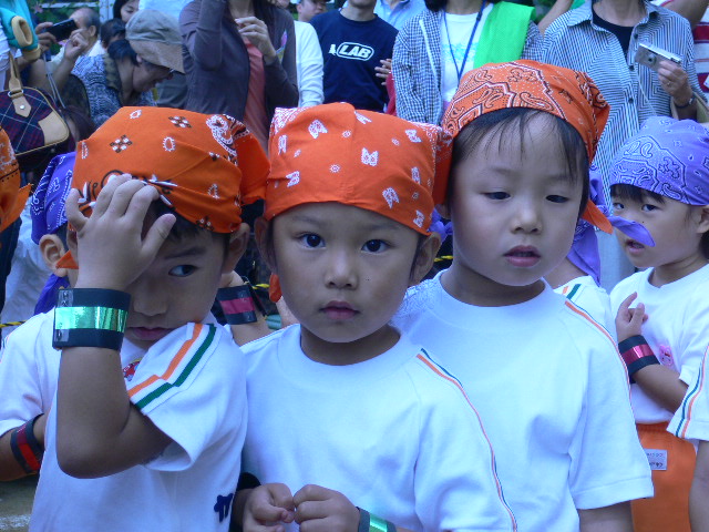 今日は、幼稚園の運動会でした朝、起きて2人に体操服を着せ、8時半の集合なので、パパとマナヒナは先に運動会がある小学校に行きましたうちは、初めてで午前中で終わると聞いていたのでイスとか脚立なんて用意していなくて、パパから『アレ持って来い!コレ持って来い!』の電話攻撃私は、実家の母が、に着くのを待っていて、洗濯も干さないといけないしサナのミルクの支度もしないといけない。でも、パパは『お前と俺、入れ替わった方がええな。』と。イエイエ、あなたに全て任したら忘れ物だらけ。イエ、意味ない物を持って行きそうなので私が、準備します。実家の母も近くの駅までタクシーで来て歩いて来ていたら道に迷ったみたいで、小学校にはギリギリセーフ何だかんだと、入場行進も終わり、マナ達の演技お天気ロックンロールが始まりました男の子に挟まれてるんだから、もっと可愛い顔したらいいのに・・・曲が流れると急に、やる気モードに入りました照れながら一生懸命やってましたちょっとワンテンポ遅かったり速かったりしてたんですが、またそこも可愛く見えました。そして、次はヒナの親子競技私はパパに出てもらおうとしたら、ダンスするとか書いてあって逃げていきましたパパが逃げたので、ヒナと集合場所に行くと、フラフープとアリさんの、かぶり物を渡され、すご~い恥ずかしかったヒナは全然楽しそうではなく、やる気がなくて『ハイチュウかってあげるから一緒にやろ?』と、言うとシブシブやってくれました。その時パパは、ちゃんとヒナの競技をビデオに撮ってくれてましたそして、私がシブシブかぶった、ありさんこれは、ホント恥ずかしい。最年少・年少の競技も午前中に終わったので、皆で打ち上げにそして、食事も終わって、あ~ちゃんは、半日仕事を休んだので夕方から仕事をするので駅まで送って帰りました。来年からは午後からもあるので、早めに行って場所取りをして、脚立・イス・小さめのテーブル準備しときま~す。参加された皆様、ご苦労様です