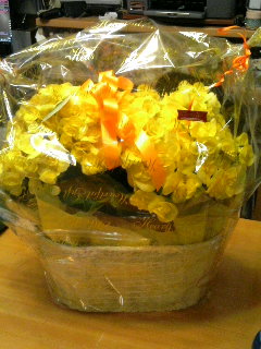 今日、わたし、28歳になりました気分は、まだまだ二十歳なんですけど。ネッ特別、変わった事をして欲しくなかったのでケーキも頼まず、普通の日だと思ってたら、バアバが仕事から早く帰って来てくれて、私にのプレゼント結婚してから、バアバは『今日、お嫁さんの誕生日やから早く帰る』と、毎年、食事誘ってくれたり、好きなもの買っていいよ!と買い物に誘ってくれたり。今年は、バアバは新園の園長に春からなったので、こんなサプライズがあるとは思いませんでしたお花は、黄色のベコニア。バアバが言うには、『黄色はお金がたまるから、西においてな。』と言って頂きました。ちょうど、私も花屋さんで、『ベコニアほしいな~』と思ってたので、ラッキーです。今日もピンクのベコニアを、羨ましそうに見てたんです。お義母さん、ベコニア大事に育てますこんな、ワガママな嫁に色々してくれてありがとうございます。これからも、ヨロシクお願いしま~す