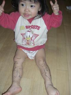 おはようございます今の時間ヒマではないのですが、サナの事で・・・最近サナは水性のペン・油性のペンが大好きなんです。紙に落書きから始まって、顔に書き始め今日は足水性ならともかく、油性で足に書くもんだから今日パパと、お出かけ行けるかどうか分かりません。マナもヒナもこんな事した事なかったのにな~
