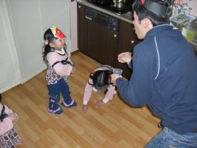 昨日は節分でしたねうちも、昨日は巻き寿司食べて、床掃除して豆まきしました。ボケた事に赤オニが4人も居てパパとマナに『オニがオニにマメまくんか?』と、突っ込まれ1回戦は赤オニ4人で2回戦からマナヒナがオニになり、サナが豆をまき3回戦は、皆がマメをまいて、最後らへんは豆を踏んで潰れてるのを掻き集めてまた投げて、掃除機で吸って終わりにしました。普通なら年の数だけ食べるんでしょうが、食べれる状態じゃなかったので、食べませんでした。普通の豆まきが出来るのは何年後になるんでしょう?