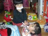 今日は~?一人できたん?えらいえらい!も~チョットしたら終わるからな~少し削るからな~痛くないよ~今日のうちの子は、歯科衛生士さんゴッコをしてました。自分達が毎回言われてる事を覚えてで実践するなんて・・・だま~って、この子達がする事を見てたら面白いんですよ~。例えば、ママゴトのコップにテープで2つゴムをつけて病院で使われてる器具で口につける酸素?名前が分からないを、してみたり、おもちゃの掃除機で吸引をしたり色々考えてしてくれるんですよ。でも今日はまだ大人しい方なんで私も穏やかに見れてます明日は何をするんでしょうね?面白ければ、また紹介します
