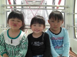昨日は、りんくうシークルへ行って来ました。観覧車を見るとたん、子供達は乗りたい攻撃パパは乗りたくない。私は高いところ苦手残るはバアバ。4人で乗ってもらいました見てるだけでも怖かったんですが、子供達はウロウロするくらい余裕だったそうです乗り終わってからマナのダンスの服を選びに行き最初にマナの好みを聞くと、キャラクター物を西松屋で選ぶので違う店に行って、ギャル系・B系を見せて試着させたら気に入らないらしく、ギャル系のフリフリのスカートを試着させたら気分も乗り、可愛いチビギャルが誕生しました。後ほど写真を撮ります買い物も終わって、キッズパークに行って発散してた三姉妹クルクル回ってる~普通に滑れんのか?月曜日は親子遠足で、昨日は、りんくうに行ったからど~と疲れが出てしまい、夜にはクタッと寝てしまいました今日は、美容院にも行ってきたしリフレッシュできましたよし!お迎えの準備でもしよ~
