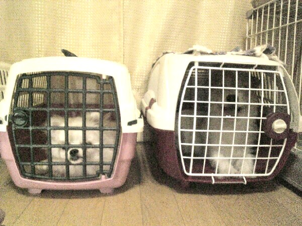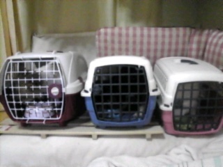 「飛び越える・・・」から 「食事待ち 動画その1・その2・その3」 となんとなぁく、食事光景つながりで更新してきましたが・・・ 最後に食事中・・・やっと落ち着いて食事タイム。最初は普通に部屋の中で、食事をさせてもみたんですがどうしても1つの入れ物から奪い合って・・・になるので、量の管理の為と、りーさんは薬を一緒に摂らないといけないのでそれぞれキャリーに入って食べてもらってます。食事の時や、たまに勝手にキャリーで寝てる事もあるんだけどこんなふうにや・・・(わかるかなぁ?)こんなふうに・・・3ワン、どのコも、閉まってる入り口を自分で前足で一生懸命に開けて入る姿・・・ 何度見ても、笑えちゃいます。でも、叱られた時もキャリーなんです。悪い事をすると、しばらく入っててもらいます。そしてお留守番の時、うーは毎回、もーはいたずら気味の時キャリーでお留守番になります。うーは、いたずらの度合いが激しいので、どうしても毎回キャリー。ちょっと広めのケージだと逆に落ち着かないみたい。キャリーの中だと、ひっくり返ってヘソ天状態で爆睡です。もーは、マーキングがひどいと預りママさんに言われてた通りかなりあちこち「ちーマン」だったので、最初は、マナーベルトでお留守番。今は、大丈夫なので、りーと一緒にお留守番中、基本はフリー。でも、時々トイレを外し気味になる時期?があるので危なそうな時は、キャリーでお留守番。叱られた後、お出掛け前、「ハウスっ」って言われて、トボトボ入る姿・・・こちらも笑っちゃいけないのに、笑えちゃって。ご飯の時とのギャプが・・・3ワンにとって、キャリーは食事のもらえるおいしい場所でもあり、たまに一人で寝るくつろぎの落着く場所でもありまた、叱られた時やお留守番の時しばらく入れられる、イヤな場所にもなるんだよねぇ。食事が終わったようです。食事前は凄い勢いで、入れなんて一言も言ってないのに喜んで勝手に入って行くくせに、食べ終わったとたん、みんな、「クゥ~ンクゥーン」「カシャカシャ」と、出せの催促。そこはビシッと・・・。甘えてもその手にはのりませんよぉっ。あきらめて、静かになってちょっとした所では~いっ、ごちそうさまぁ。と一斉に開放っ。凄い勢いでキャリーから飛び出して、遊び始めます。(食後の運動なのかなぁ?)うー : 足りません。もうちょっと下さい・・・りー : 食べたよっ。出ていい?もー : 足りなぁーいっ! だせぇーっ! お願いっ。だしてぇ。