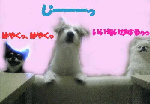 食事の準備を始めると、号令がかかったように一斉に集合する3ワンですが・・・出来上がるまで、熱~い視線を投げかける3ワンですが・・・最近この中で約1ワン、その状態からひたすら、ピョンピョン×2 跳ねるヤツが・・・ソファーの背もたれの上の部分に乗せた前足で体を支え、ひたすら跳ねる。とにかく跳ねる。ずーーーっと跳ねる。まるで、「 ごはんっ・ごはんっ・ごはんっ! 」って言葉が聞こえてきそう・・・ボクですか?前足だけで体を支えて、背もたれ伝いに後ろ足でよじ登ってあの細い狭い所に乗っかってるし。前足プルプルいってるし。とにかく跳ねて跳ねて、日々どんどん跳躍力が・・・「 コイツそのうち飛び越えるぞ・・・ 」と、パパさん。いえいえ。パパさんご心配なく・・・。もう既に、見事に飛び越えてますから・・・。背中を向けてご飯の準備をしてたら後ろで 「ドスンッ。」って音がしましたから・・・。足元にしっかり「うーさん」着地でしたから・・・(汗)。まったくぅ。誰がそんな事教えたんだぁっ!叱られるので、最近は飛び越える事はなくなったけどそのかわり、ひたすら跳ねる → 乗っかって、足プルプル。の繰り返し・・・。(-_-;)だって、待ちきれないんだもんっ。!